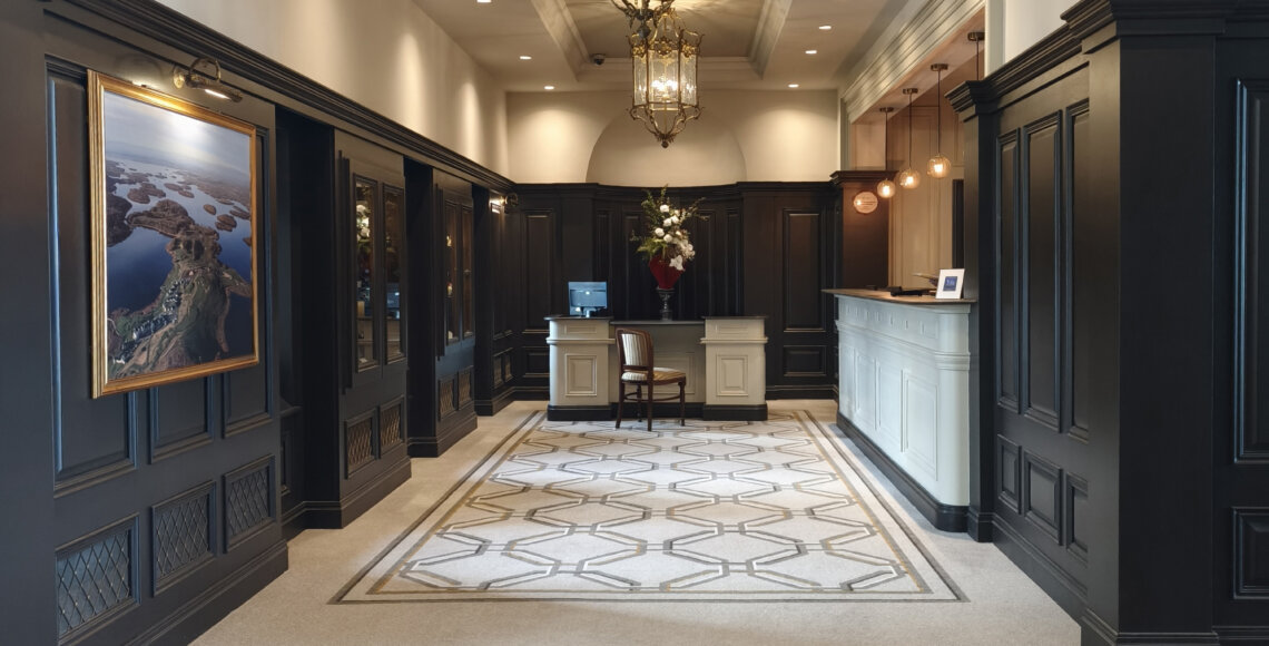 We developed a palette of soft blues and greys, reflecting its unique location overlooking the Velvet Strand. Even the bespoke carpet designs mirror the patterns of sand left by the outgoing tide.