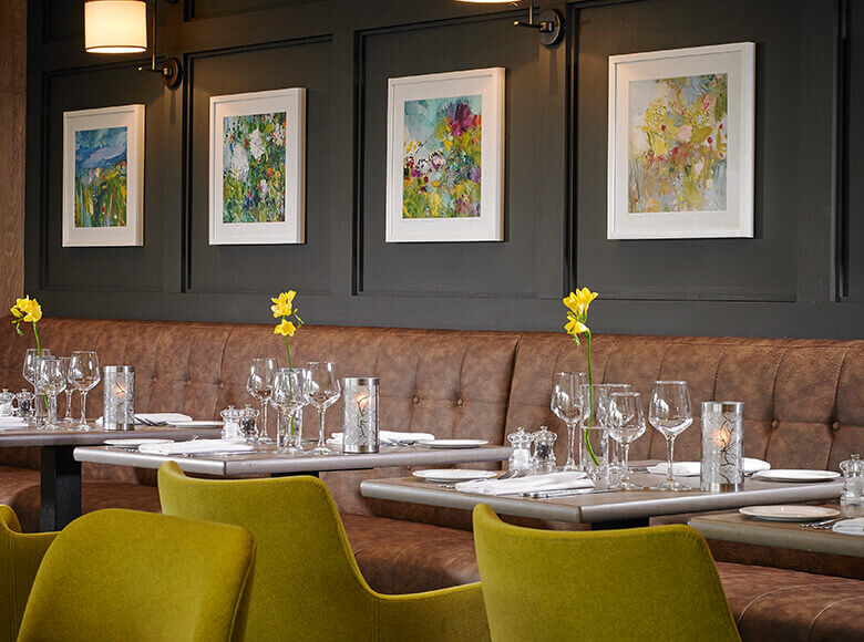The hotel had been developed and extended over 40 years, so the challenge was to pull all the elements into a cohesive whole, remodelling the public areas and creating a sense of arrival. To reflect the colours and textures of the surrounding countryside. a palette of soft greys, greens, terracotta, ochre, in wools and linens, runs through the ground floor, with different colours coming to the fore in each area.
